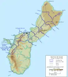 В марте 1944 года командир 29-й дивизии генерал-лейтенант Такэси Такасина прибыл на Гуам и принял командование всеми воинскими формированиями, участвовавшими в обороне острова[13]. Во время подготовки к возможному десанту американцев главные силы 18-го полка укрепились на горе: по одной роте было отправлено для охраны возможных плацдармов для высадки, чтобы следовать оборонительной стратегии[2]. 21 июля 1944 года американцы начали высадку и захватили два пляжа к ночи силами Корпуса морской пехоты и сухопутных войск, несмотря на ожесточённое сопротивление японских войск[17]. Американцы дошли до полуострова Ороте, хотя японцы предпринимали контратаки, обстреливая американцев из артиллерии (в том числе миномётной) и пулемётов[18].