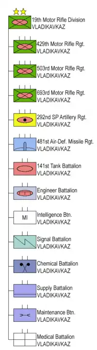 - Всего на 1 января 2000 года 19-я дивизия при общей численности личного состава 11240 чел. располагала 120 танками Т-72; 330 БМП и БТР; 72 САУ 2СЗ «Акация»; 16 РСЗО (4 9П140 «Ураган», 12 БМ-21 «Град»).