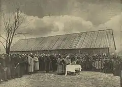 Молебен перед отправлением 1400 полтавских крестьян-ходоков в Тобольскую и Оренбургскую губернии.