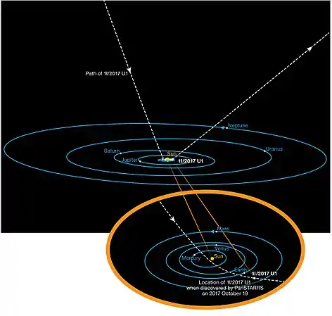1I/Оумуамуа (ранее C/2017 U1 (PANSTARRS) и A/2017 U1) — первый обнаруженный межзвёздный объект, пролетающий через Солнечную систему. Был открыт 19 октября 2017 года, на основе данных телескопа Pan-STARRS. Первоначально Оумуамуа считался кометой, но спустя неделю он был переклассифицирован как астероид[11]. Это первый открытый объект нового класса гиперболических астероидов[10].