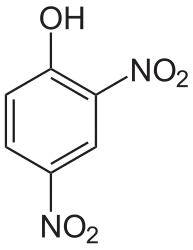 2,4-Динитрофенол (2,4-ДНФ или просто ДНФ) — нитропроизводное фенола, имеющее химическую формулу HOC6H3(NO2)2. При нормальных условиях кристаллическое твёрдое вещество желтого цвета, имеющее сладковатый запах, напоминающий запах плесени. Сублимирует, улетучивается с водяным паром, растворяется в большинстве органических растворителей, а также в водно-щелочных растворах[2]. ДНФ биохимически активен. В высоких дозах применяется в качестве средства для борьбы с избыточным весом, однако его применение связано с серьёзными побочными эффектами, включая случаи летального исхода от употребления.[3]