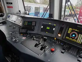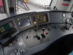 Пульт машиниста выполнен в удобном традиционном стиле. Рукоятки управления тягой и электрическим торможением размещены под левую руку машиниста, а рукоятки управления пневматическими тормозами — под правую. На наклонной панорамной панели перед машинистом размещены основные приборы индикации и дисплеи для контроля параметров локомотива.[20]