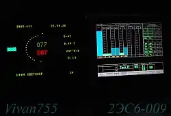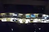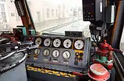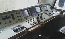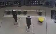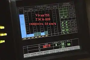 | Встроенная подсветка ходовой части в тёмное время (снизу ряд огней напротив каждого колеса локомотива) | Светодиодная местная подсветка приборов и рабочего места (по отдельности) с регулятором яркости | Для удобства машиниста и помощника локомотивы оборудованы холодильниками, СВЧ-печями и биотуалетами | Элемент пульта управления электровоза 2ЭС6 | Интерьер кабины машиниста Синары. Д. А. Медведев за рабочим местом машиниста, подлокотники кресла подняты | Для сравнения - интерьер кабины машиниста электровозов серии ВЛ-10, ВЛ-11. Рабочее место машиниста |