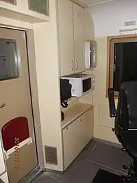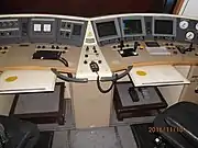 | Рабочие места на 2ЭС6-640 помощника машиниста (слева) и машиниста (справа) | Панель управления 2ЭС6-050 им. Соснина В. Ф. (правая часть панели) | Шкаф для средств защиты (одежды, обуви, перчаток и т.д.) | Виброзащитное кресло экипажа | Тамбур между кабиной машиниста (слева) и машинным отделением (справа) |