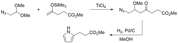Как производное альдегида, 2-азидо-1,1-диметоксиэтан вступает в типичные реакции конденсации с енолами и енолятами. Часто азидную группу в полученных продуктах восстанавливают для дальнейшей циклизации в пирролы[1].
