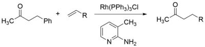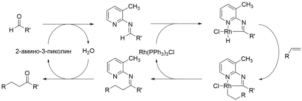 В присутствии родиевого катализатора алкены реагируют с альдегидами, давая продукты гидроацилирования. В этом процессе 2-амино-3-метилпиридин участвует как органический катализатор, образуя с исходным альдегидом имин и тем самым способствуя координации родиевого катализатора и образованию целевого кетона. В отсутствие 2-амино-3-метилпиридина кетон не образуется, а реакция протекает по пути декарбонилирования[1].