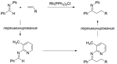 Похожую реакцию можно провести не с альдегидами, а с их азотистыми аналогами — иминами. Роль 2-амино-3-метилпиридина здесь заключается в том, что он переиминирует исходный имин, образуя более реакционноспособный субстрат. Позже, когда произошла реакция с алкеном, происходит обратное переиминирование и получается искомый продукт[1].