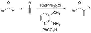 Аналогичная реакция существует также для алкинов. С помощью той же каталитической системы удаётся эффективно синтезировать разветвлённые α,β-ненасыщенные кетоны из ароматических альдегидов и алкинов[1].