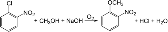 При взаимодействии 2-нитрохлорбензола с 80—90 % водным раствором метанола при 95—110 °С в течение 4—8 часов в присутствии воздуха или кислорода и щёлочи в промышленности получают 2-нитроанизол[16]:
