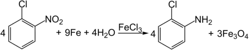 При восстановлении чугунной стружкой в присутствии хлористого железа образуется 2-хлоранилин[12]: