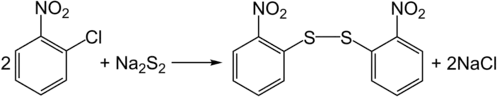 При взаимодействии 2-нитрохлорбензола с дисульфидом натрия образуется 2,2'-нитродифенилдисульфид, используемый для синтеза ортаниловой кислоты[18]: