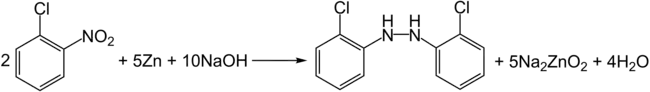 При восстановлении же 2-нитрохлорбензола цинковой пылью в щелочной среде получается 2,2'-дихлоргидрабензол[12]:
