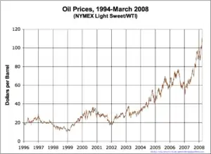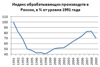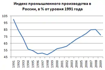 2000-е годы в экономике России: в 2000—2008 годах в экономике России отмечался рост ВВП (в 2000 — 10 %, в 2001 — 5,7 %, в 2002 — 4,9 %, в 2003 — 7,3 %, в 2004 — 7,2 %, в 2005 — 6,4 %, в 2006 — 7,7 %, в 2007 — 8,1 %, в 2008 — 5,6 %), промышленного и сельскохозяйственного производства, строительства, реальных доходов населения[1]. Происходило снижение численности населения, живущего ниже уровня бедности (с 29 % в 2000 году до 13 % в 2007).[2][3]. С 1999 по 2007 годы индекс производства обрабатывающих отраслей промышленности вырос на 77 %, в том числе производства машин и оборудования — на 91 %, текстильного и швейного производства — на 46 %, производства пищевых продуктов — на 64 %[4]. В 2009 году на фоне мирового экономического кризиса произошёл спад ВВП на 7,9 %.