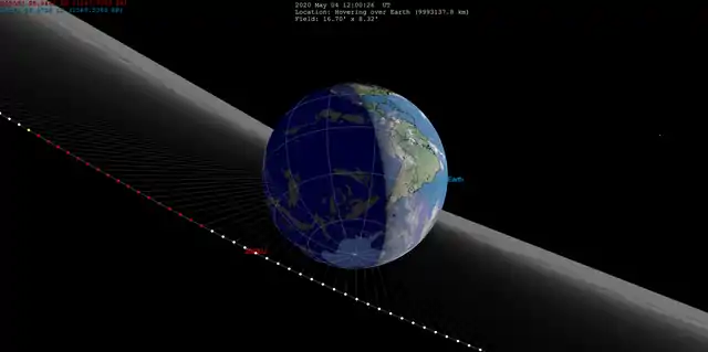 | Пролёт астероида 2020 JJ, метки даны с периодичностью 1 минута, пролёт проходил слева направо. Красным цветом показана тень Земли. |