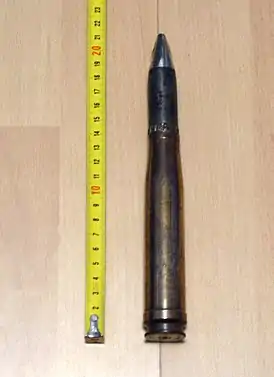 ![]() Патрон 20×138B, в донной части различима выступающая кольцевая поверхность - опорный буртик - над канавкой под экстрактор. | |