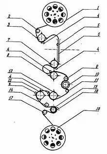 В проекторе используются пять зубчатых барабанов (по ходу плёнки сверху вниз): тянущий (3), скачковый (7), успокаивающий (8), звуковой(12), задерживающий (13). Для каждого зубчатого барабана сделан придерживающий ролик. В фильмовом канале плёнку придерживает поперечно-направляющий ролик (5). К гладкому барабану, расположенному у блока звукочитающей системы фильм прижимается роликом. Ниже расположены несколько продольно-направляющих роликов. Завершает ЛПТ наматыватель (18)[1]. Ёмкость бобин для киноплёнки — до 600 метров, что позволяет заряжать сразу две части фильмокопии и сократить количество переходов с поста на пост.