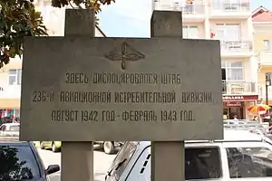 В посёлке Лазаревском города Сочи, где в августе 1942 — феврале 1943 года размещался штаб дивизии, установлена памятная доска. Рядом с территорией, где в годы войны размещался военный аэродром, на постаменте установлен самолёт МиГ-23МЛД с бортовым номером 263 в память о 236-й истребительной авиационной дивизии, базировавшейся в Лазаревском в период с 15 августа 1942 года по 25 февраля 1943 года.