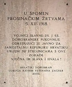 В 1918 году было образовано Государство словенцев, хорватов и сербов, и начался процесс роспуска Королевского хорватского домобранства. 5 декабря 1918 в 13 часов солдаты 25-го домобранского пехотного полка вышли на Площадь бана Йосипа Елачича в Загребе, протестуя против роспуска домобранства. Вместе с гражданами они подняли несколько хорватских флагов, выкрикивая слова «Республика» и «Хорватия». Однако с крыш внезапно по протестующим открыли огонь из ружей и пулемётов. В результате стрельбы погибло 13 человек и было ранено 17.