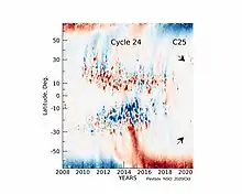 Суперсиноптическая (время в зависимости от солнечной широты) карта радиальной компоненты солнечного магнитного поля для циклов 24-25, основанная на наблюдениях Global Oscillations Network Group (GONG)[6] , показывает магнитную активность 25-го цикла, начиная с ноября 2019 года, примерно на 30 градусах широты в оба солнечных полушария.