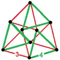 в имеет вещественное представление как 3-3 дуопризма в 4-мерном пространстве. 3{4}2 имеет 9 вершин и 6 3-рёбер. Его группа симметрии 3[4]2 имеет порядок 18. Многогранник имеет также построение с меньшей симметрией ![]()