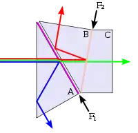Дихро́идная призма — основной элемент трёхматричной системы цветоделения.[10] При расчете цветоделительной системы должно учитываться, что длина хода лучей каждого цвета должна быть одинаковой с учётом разницы коэффициентов преломления стекла разных частей призмы. Кроме того, при проектировании призм для использования с полупроводниковыми матрицами не допускается получения зеркально перевёрнутых изображений, как это было возможно при использовании вакуумных передающих трубок. В последних это устранялось простым изменением полярности развёрток. Дополнительную сложность при конструировании трёхматричных камер представляет устранение влияния поляризации света на качество цветоделения. Существует множество различных конструкций цветоделительных призм с разным расположением граней и выходных поверхностей. Рабочий отрезок объективов для камер с таким способом цветоделения обычно указывается в виде двух значений, одно из которых справедливо для стекла, а другое — для воздуха, то есть для одноматричных камер без призмы.