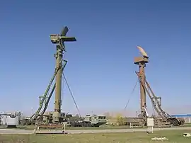 ![]() Низковысотный обнаружитель 76Н6 (слева) и радиолокатор подсвета наведения 30Н6 (справа) на вышках 40В6М . | |