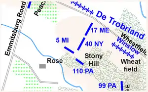Бригада Тробриана пришла к Геттисбергу утром второго дня сражения. Днём бригада была размещена у Каменистого Холма, но когда началась атака корпуса Лонгстрита, командование забрало 40-й Нью-Йоркский у Тробриана и перебросило его на левый фланг, для поддержки бригады Уорда.