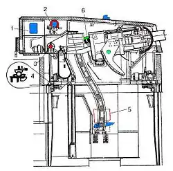 Заряжание орудий башенной установки производилось при постоянном угле заряжания 6°[26]. Каждое орудие башни имело индивидуальную люльку. Система противооткатных устройств состояла из двух пневматических накатников (один над стволом, другой под стволом), четырёх тормозов отката и наката веретённого типа и четырёх дополнительных буферов наката симметрично оси орудия[10]. Откатная часть орудия весила 141 т[22]. Вариантов уравновешивающего механизма имелось несколько, в том числе пневматический и грузовой. Качающийся 180-мм щит орудия состоял из верхней и нижней половин[10].