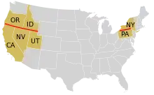 На востоке США 42-я параллель служила границей между Пенсильванией и Нью-Йорком, судя по всему, из-за ошибочной интерпретации выданной У. Пенну хартии (в ней говорилось о территории «от начала 40-го градуса до начала 43-го градуса», что Пенн проинтерпретировал как пространство между 39-й параллелью и 42-й). Частичный успех на юге (хотя Калверты и понимали географию по-другому, после переговоров граница прошла около линии 39° 44' северной широты) привёл к неуспешной попытке расшириться на север. В конце концов часть современной границы между рекой Делавэр и озером Эри прошла-таки по 42-й параллели[2].