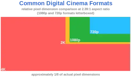 Разрешение 4K превосходит другой стандарт — 2K — приблизительно вдвое по каждой стороне кадра.