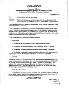 - a b 14 October 2005 OARDEC (14 October 2005). «Unclassified Summary of Evidence for Administrative Review Board in the case of» pages 53-55. United States Department of Defense. Retrieved on 2007-12-14.