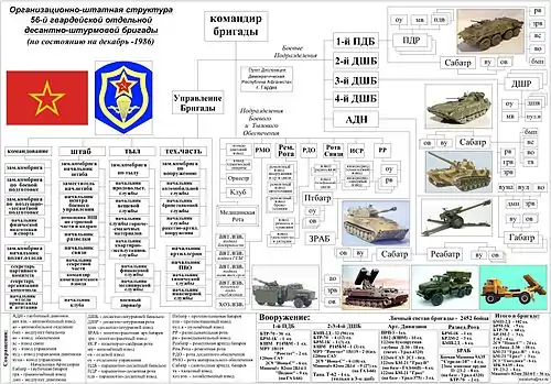 Штатная численность личного состава 56-й гв. одшбр на 1 декабря 1986 составляла 2452 человека (261 офицер, 109 прапорщиков, 416 сержантов, 1666 солдат)[5].