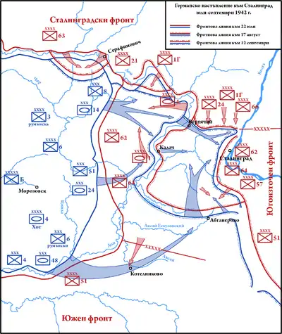 После взятия Воронежа (пал 6 июля 1942) 4-я танковая армия вермахта двинулась в большую излучину Дона; одновременно из района Ворошиловграда по направлению к Волге продвигалась 6-я армия Паулюса. Немецкое наступление создавало угрозу для Сталинграда — крупного промышленного и транспортного узла на Волге[lower-alpha 2]. После неудачной обороны Воронежа Сталин отстранил от командования Сталинградским фронтом С.К. Тимошенко и назначил на его место В.Н. Гордова (21 июля). Навстречу противнику в излучину Дона были направлены две армии[lower-alpha 3]: 62-я (ком. В.Я. Колпакчи) и 64-я (ком. В. И. Чуйков), усиленные 1-й танковой армией (ком. К.С. Москаленко).