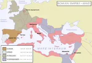 - Январь — Рейнские легионы восстали и провозглашают императором Вителлия. Вителлий стал называть себя Германиком. 11.1 — Гальба усыновил Пизона и назначил его своим преемником. 15.1 — Преторианцы в Риме поднимают мятеж, убивают Гальбу и провозглашают императором Отона. Убийство Виния и Пизона.