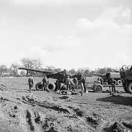 ![]() 7,2-дюймовая гаубица на станке M1 в ходе Рейнской операции союзников, 1945 год. | |