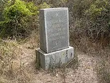 Бетонная пирамидка на месте позиций бригады со звездой и посвятительной надписью. Дикорастущие заросли опунции.