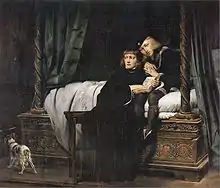 | Франциск I и Карл V перед королевскими гробницами в соборе Сен-Дени | Charles Quint reçu par François Ier à l’abbaye de Saint-Denis | Антуан Жан Гро | 1812 | |