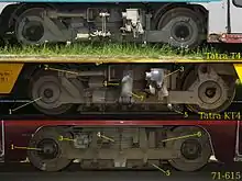 Тележки вагона — рамной конструкции с независимой подвеской тяговых двигателей. Рама тележки сварной конструкции состоит из двух продольных и двух концевых балок замкнутого сечения. Через буксовые узлы наружного типа рама тележки опирается на две оси открытого типа. Буксовый узел состоит из осевых подшипников и резиновых прокладок. Рессорное подвешивание состоит из резинометаллических элементов и винтовых пружин, колёса — подрезиненные. На тележке установлены соленоиды привода механического тормоза и электромагнитные башмаки рельсового тормоза[1].