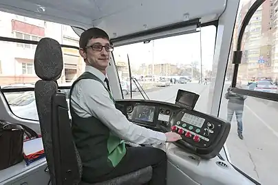Кабина водителя обеспечивает максимальную обзорность и высокую эргономичность водительского места; кроме того, в трамвайном вагоне предусмотрены интерактивное управление, наружная система видеоконтроля зон посадки-высадки пассажиров и мониторинга дорожной ситуации, дополнительные элементы пассивной безопасности рабочего места водителя, системы активной и пассивной помощи водителю при управлении трамвайным вагоном.