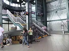 Выход со станции производится через турникетный зал, расположенный в мезонине в центральной части платформ. С мезонина ведёт переход на соседнюю станцию. С запада от станции расположены многочисленные съезды, не используемые для регулярного движения.