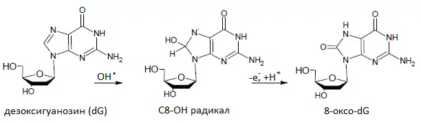 ДНК в живых системах постоянно подвергается действию активных форм кислорода,таких как супероксиданион-радикал (O2-), перекись водорода (H2O2) и высокореактивный гидроксил-радикал (OH·). Гуанин обладает самым низким потенциалом ионизации среди природных азотистых оснований, поэтому наиболее подвержен окислительному повреждению[1]. Образование 8-оксо-2’-дезоксигуанозина в результате реакции 2’-оксигуанозина с гидроксилрадикалами изображено на рисунке внизу.