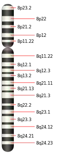 Ниже приведен список некоторых заболеваний, ассоциированных с генами хромосомы 8: