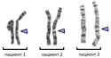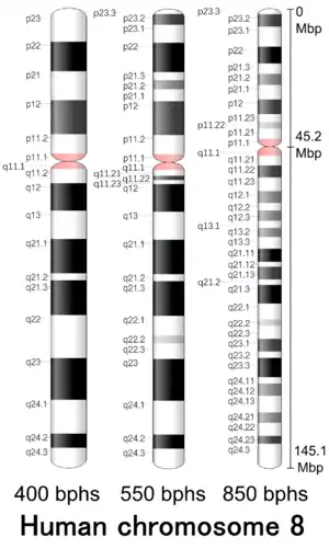 ![]() Идиограмма цитогенетического дифференциального окрашивания 8-й хромосомы человека в разрешении 850 полос на кариотип. Длина бэнда на идиограмме пропорциональна количеству пар нуклеотидов. Данный тип идиограмм используется в геномных браузерах (например, Ensembl, UCSC Genome Browser) | ![]() Идиограмма цитогенетического дифференциального окрашивания 8-й хромосомы человека в трёх различных разрешениях (400[4], 550[5] и 850[6]). Длина бэнда на этих идиограммах основана на идиограммах от ISCN (2013)[7]. Этот тип идиограмм основан на измерениях микрофотографий метафазных хромосом разной степени конденсации[8] |
