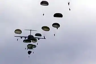 Десантники 80-го отдельного аэромобильного полка и американской 82-й воздушно-десантной дивизии десантируются с самолёта C-17 Globemaster III, Яворов, июль 2000 г.