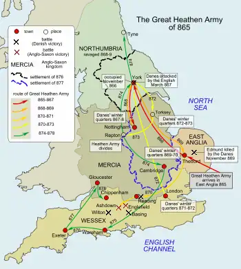 - Вторжение датчан в Британию, завоевание Восточной Англии и юго-восточной Нортумбрии.