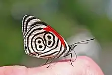 Узор в виде числа 88 на нижней стороне задних крыльев бабочки Diaethria anna из Южной Америки