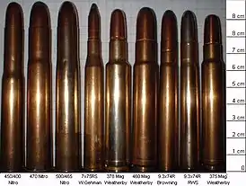 ![]() Патроны 9,3×74 мм — второй и третий справа | |