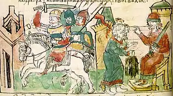 Игорь берёт дань от древлян. Иллюстрация из Радзивилловской летописи.