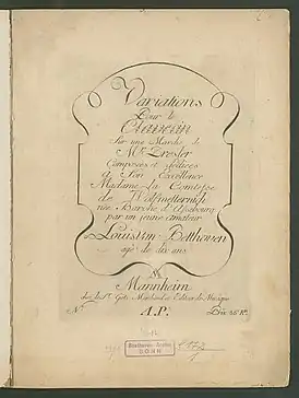 Вариации появились в 1782 году в мангеймском издательстве Иоганна Михаила Гётце (1738—1811) благодаря усилиям Нефе. Они были посвящены графине Фелиции фон Вольф-Меттерних. На титульном листе на французском языке указывалось, что они созданы десятилетним композитором Louis van Beethoven. Видимо, это было вызвано занижением возраста на два года, что впоследствии стало причиной недоразумений, так как композитор и в зрелом возрасте говорил, что ему на два года меньше чем в действительности. По этому поводу российский исследователь Лариса Кириллина писала: «Вероятно, такую уверенность поселил в нём отец, который при первом публичном выступлении сына из практических соображений убавил ему возраст, и в самых ранних публикациях сочинений Бетховена всегда фигурировала искажённая информация»[2].