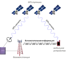 A-GPS (англ. Assisted GPS) — технология, ускоряющая «холодный старт» GPS-приёмника[прим. 1]. Ускорение происходит за счёт предварительной загрузки в приёмник необходимой информации не со спутников, как обычно, а через другие, более быстрые каналы связи (Wi-Fi, Bluetooth и пр.). Часто используется в сотовых телефонах, содержащих и приёмник GPS. Очень часто путают с LBS. Благодаря технологии A-GPS при включении навигации устройство практически мгновенно определяет своё местоположение, причем поиск спутников возможен даже в закрытых помещениях, а межэтажные перекрытия не являются помехой.[1]